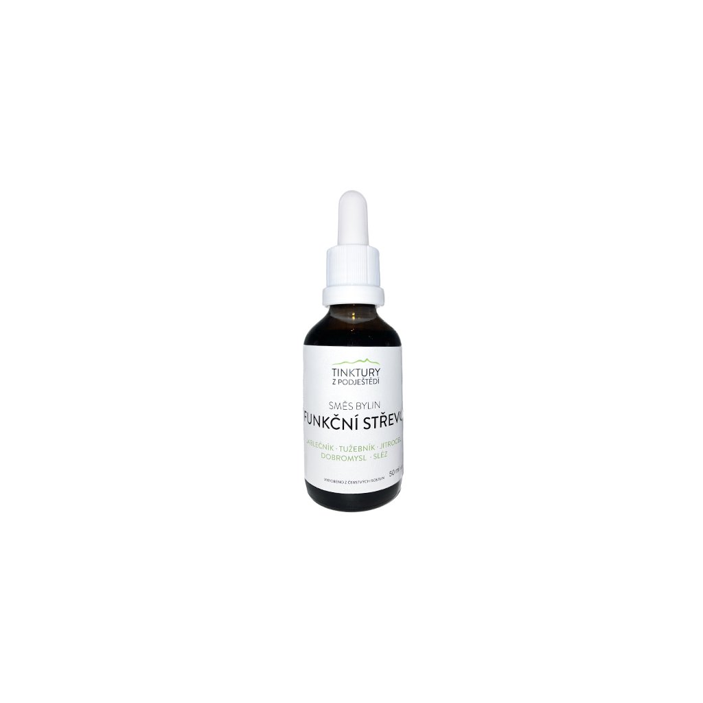 Funkční střevo – bylinné kapky jsou tinktura z čerstvých rostlin zaměřená na podporu trávení a střevního prostředí. Kombinace tradičních bylin vytváří harmonickou směs připravovanou ručně z rostlin pocházející z ekofarmy v Podještědí.