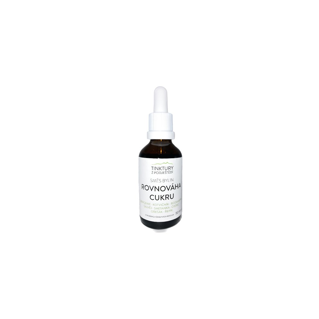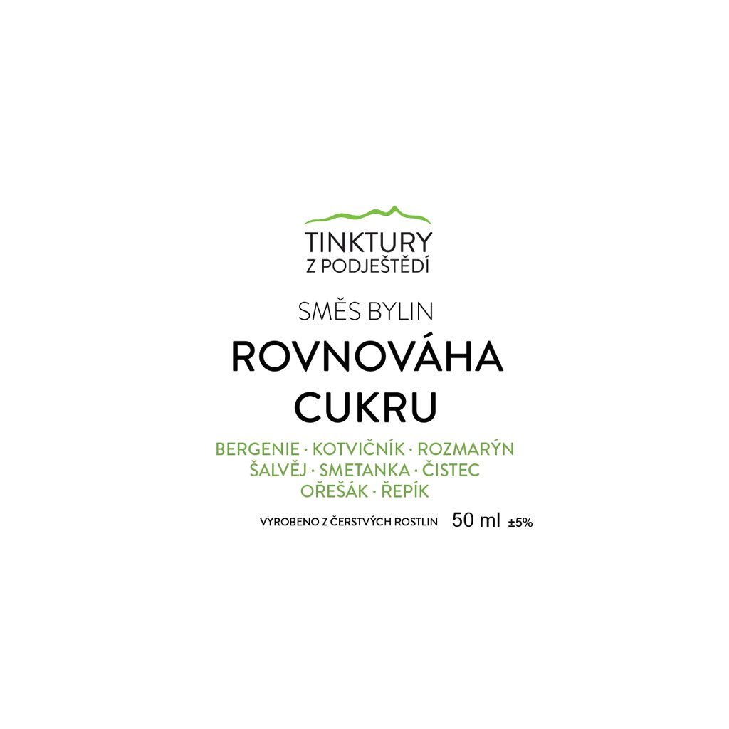 Tinktura Rovnováha cukru jsou bylinné kapky z čerstvých rostlin zaměřené na podporu normální hladiny glukózy v krvi a přirozených metabolických procesů v organismu. Směs tradičních bylin vzniká ručním zpracováním rostlin pěstovaných na ekofarmě v Podještědí.