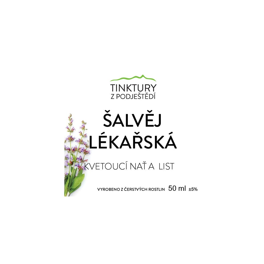 Bylinná tinktura z čerstvých listů a kvetoucí natě šalvěje lékařské (Salvia officinalis). Aromatický polokeř původem ze Středomoří patří mezi tradiční léčivé rostliny známé již od starověku. V bylinářství je známá především v souvislosti s trávením, hormonální rovnováhou a zdravím žen, a také oblastí pocení, proto je často vyhledávána například jako šalvěj na pocení.